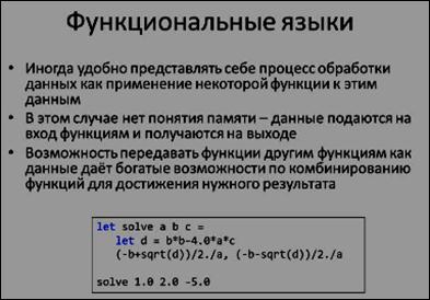 Функциональные языки очень удобны для обработки данных. В качестве примера мы приводим здесь программу для решения квадратного уравнения на объектно-ориентированном функциональном языке F# (Эф шарп). На слайде мы видим, что уравнение решается с помощью некоторой функции solv c тремя параметрами; далее мы объявляем имя -d- (дискриминант), который будет равен некоторому выражению. При этом это не то же самое, что переменная, поскольку такое объявление имени не позволяет вам потом изменять значение этой переменной. В этом случае нет понятия «ячейка памяти» - данные подаются на вход функциями и получаются на выходе. Это выражение лишь описывает синоним, который затем подставляется в выражение для вычисления результата.