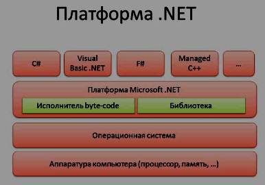 Что же такое платформа Microsoft Dot Net? – это некоторая надстройка над операционной системой, которая содержит в себе небольшую виртуальную машину, способную исполнять набор инструкций, называемых byte-кодом. И этот byte-код может получаться из разных языков. Мы можем программировать на C#, можем программировать на языке Visual Basic, который очень похож на C#, имея подробный синтаксис на функциональном языке C#..