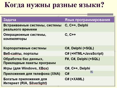 - на самом деле различные языки удобны для решения различных задач. Например, если мы хотим операционную систему или какую-то систему реального времени, которой требуется очень высокая производительность, очень высокая скорость реакции, наверное, нам стоит обратиться к языкам C и С++ вне платформы Microsoft Dot Net, которая работает непосредственно на оборудование. Если же мы пишем корпоративные системы, web-сайты, Интернет порталы, то здесь платформа Microsoft Dot Net будет очень-очень удобна. Кстати мы можем использовать и язык C#. Язык F# очень удобен для обработки данных, если мы хотим писать компиляторы или системы, которые производят преобразования научных данных каких-то, научные расчеты или, наоборот, сбор данных из Интернет Язык C# будет очень удобен.