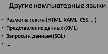 Помимо языков программирования нам также понадобится знать некоторые другие компьютерные языки, которые на слайде 12 указаны в скобках: XMAL (читается: ксамэл), HTML, SQL.