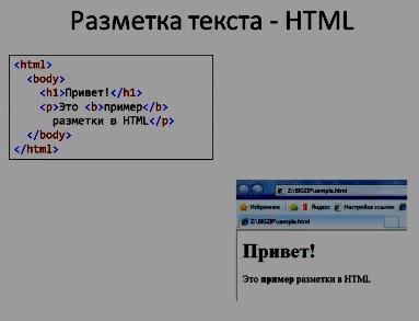 Язык HTML – это язык разметки, для которой необходим при Интернет программировании. Как формируется Интернет страница? – по сути дела это текст, который дополнен специальными тегами, которые здесь пишутся в таких угловых скобочках и тэги позволяют указывать, как же мы хотим, чтобы браузер отобразил текст. Т.е. это не инструкция для выполнения, а декларативные указания на то, как бы было хорошо этот текст нарисовать на экране. В данном примере мы видим, что слово Привет! – это заголовок 1-го уровня, он заключается в тэги <h1></h1> - открывающий тэг <h1> и закрывающий тэг </h1> со слэшем. Слово пример здесь выделено жирным и, соответственно оно выделяется тэгом <b></b> от слова bold для того чтобы оно было напечатано жирным. Тэг <p></p> обозначает абзац и т.д.. Тэг <p> … они все вложенные, они выполняют роль скобок. Другим примером языка разметки интерфейса является язык XMAL, который используется для создания сервер-lite приложений или богатых приложений для Windows и пишется на платформе Dot Net.