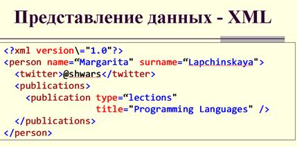 Идея языка HTML нашла свое отражение в более общем языке. (слайд 16) под названием XML (читается эксэмэль) – Extenced Markup Language. Этот язык позволяет представлять любые данные, имеющие слабоструктурированную такую иерархическую древовидную структуру. И XML на самом деле представляет собой семейство языков, мы можем сами придумывать свои языки на базе XML, важно, чтобы они имели общее свойство, вложенные тэги, которые правильно построены – без нарушения вложенности и по определенным правилам. Ну, например, мы можем использовать для описания людей …, пример которого приведен здесь. Описываем человека, его атрибуты (имя, фамилия) и вложенные тэги: <twitter> - account, <publication> – список публикаций. Для запросов к таким данным может использоваться язык под названием XQuery, который позволяет делать различные срезы XML данных, преобразуя их и выбирая только те данные, которые нам нужны. Соответственно, если мы создаем какое-то приложение, мы можем использовать XML для совершенно различных целей: для передачи по Интернет с последующей обработкой, для хранения данных на диске и т.д. и т.п.