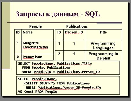 Реляционные базы данных состоят из набора таблиц, например, если мы хотим объединить людей и связанные с ними публикации, нам потребуется, как минимум, две таблицы: одна – для людей и вторая – для публикации, в которой есть номер – ссылка на таблицу с автором. И для того, чтобы такие данные из таблиц извлекать, как-то ими манипулировать, служит язык SEQUEL (читается сиквел) или, как его еще называют, SQL - Structured Query Language – язык структурированных запросов. Предположим, нам хочется выбрать имя автора и название публикации. В этом случае мы пишем запрос, который приведен здесь на слайде: мы выбираем People.Name из таблицы публикаций, поле Title. И нам нужно объединить эти две таблицы, чтобы попадали только те записи, где человек, номер человека совпадает с номером человека из таблицы публикаций. Поэтому мы пишем соответствующее условие.