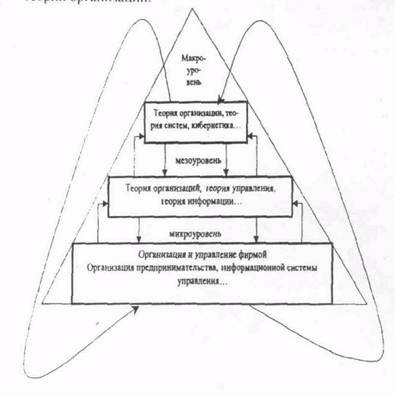 иерархии, в то время как теория организации, теория систем, кибернетика находятся на макроуровне, т.е. верхней ступени. Дальнейшая детализация исследования организационных проблем в конкретных хозяйственных отраслях и на предприятиях (организация промышленных предприятий, организация предпринимательской деятельности, организация находятся на макроуровне, т.е. верхней ступени. Дальнейшая детализация исследования организационных проблем в конкретных хозяйственных отраслях и на предприятиях (организация промышленных предприятий, организация предпринимательской деятельности, организация научных исследований и разработок и др.) могут быть отнесены к микроуровню, т.е. к нижней ступени иерархии организационных наук (рис. 1.3). Таким образом, можно сделать вывод, что теория организаций является лишь одной из ветвей общей теории организации