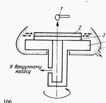 Метод центрифугирования (рас. 9.4) применяется для круглых подложек, т. е. пластин кремния и других полупроводников. Подложки располагаются на диске центрифуги и удерживаются при вращении вакуумным прижимом. Несколько капель фоторезиста наносят на подложку и мгновенно включают центрифугу, так как вязкость фоторезиста очень быстро меняется в результате испарения растворителей. При вращении центрифуги жидкий фоторезист растекается по поверхности подложки под действием центробежных сил, пропорциональных числу оборотов центрифуги За счет поверхностного натяжения фоторезиста возникают силы сопротивления растекания.