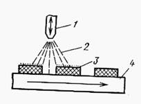 | Рис. 9.5. Нанесение слоя резиста распылением: 1 – сопло форсунки; 2 – диепергированный резист; 3 – подложка; 4 – стол установки |