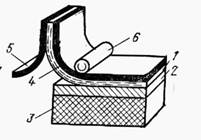 | Рис. 9.6. Нанесение слоя резиста окуяанием: 1 – полложка; 2 – слой резиста; 3 -- ванна; 4 – вода или растворитель | Рис. 9.7. Нанесение слоя резиста накаткой: 1 – пленочный резист; 2 – пленка на подложке 3; 4 – несущая полимерная пленка; 5 – защитная пленка; 6 – валик для накатки |