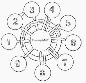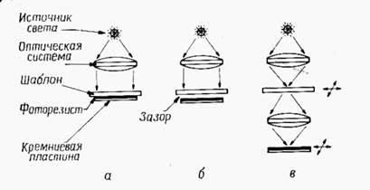 | Рис. 9.9. Методы оптической литографии: а – контактный, б –бесконтактный, в – проекционный |