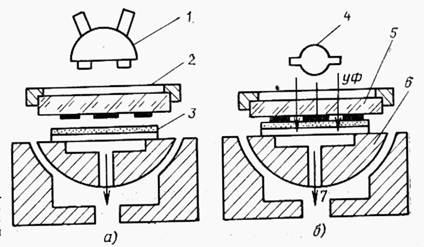 | Рис. 9.10. Схема совмещения (а) и контактного экспонирования (б) в процессе фотолитографии: 1 – двухнольный микроскоп; 2 – шаблонодержатель; 3 – подложка с фотослоем: 4 – источник УФ излучения; 5 – фотошаблон: 6 – шаровой столик; 7 – откачка |
