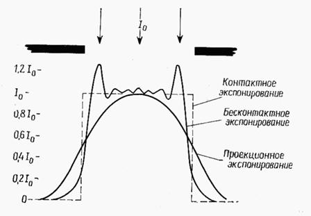 Контактная ФЛГ широко применяется в настоящее время и является наиболее отработанным методом, отличается высокой производительностью и невысокой стоимостью. Вследствие тесного контакта фотошаблон – подложка достигаются приемлимые разрешения: так на фотослой ФП толщиной 0,5 мкм можно передать элементы размерами 1 мкм. Дальнейшее совершенствование технологии получения топологии элементов ИМ вызывает необходимость повышения степени интеграции, т.е. развивать применение бесконтактных методов экспонирования и уменьшения дифракционных явлений.