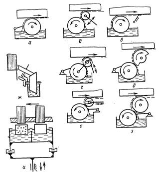 На рис. 81 показаны схемы устройства наиболее распространенных клеевых аппаратов, отличающихся по принципу действия. На рис. 81 а, б, в изображены устройства для непрерывного нанесения клея на поверхность корешка: в первом варианте толщина слоя клея регулируется ножом; во втором – изменением межцентрового расстояния между клеевым цилиндром и клеенаносящим валиком; в последнем излишки клея с корешка блока снимаются скребком и стекают обратно в резервуар.
