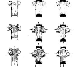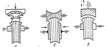 В некоторых случаях в одной позиции одновременно могут работать два различных инструмента для кругления блока. На рис. 83 а показаны три последовательных (сверху вниз) положения блока при его круглении только вращающимися валиками. На рис. 83 б кругление блока происходит в результате одновременного воздействия профильных колодок на передок и корешок блока и вращающихся валиков на крайние тетради блока. На рис. 83 в в процессе кругления также участвуют два вида инструмента, но валики не вращаются, а только сжимают блок с двух сторон, создавая опору и тормозящее сопротивление смещению крайних тетрадей. Наиболее производителен и конструктивно сложен второй вариант. Объединяя в одной позиции два вида инструментов, можно получить компактную и производительную конструкцию устройства для кругления. В результате отгибки и прессования корешковых фальцев тетрадей в книжных блоках повышается прочность соединения тетрадей между собой и прочность соединения блоков с переплетными крышками. После отгибки фальцев профиль корешка блока из полукруглого превращается в грибообразный. Фальцы тетрадей в блоке должны быть симметрично отогнуты в обе стороны относительно середины. Отгибка фальцев выполняется в два приема: сначала корешковая часть зажимается тисками, а затем поверхность корешка обрабатывается специальными инструментами. Отгибку фальцев можно выполнить различными способами. Устройства для отгибки фальцев тетрадей в корешках блоков представлены на рис. 84.
