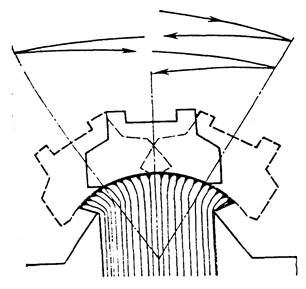 Симметричность достигается одинаковым числом рабочих качаний колодки в каждую сторону от середины корешка. На рис. 85 показана отгибка фальцев профильной качающейся колодкой. Два с половиной рабочих перемещения в каждую сторону формируют симметричное грибообразное поперечное сечение блока. В некоторых машинах одновременно работают две симметрично установленные относительно корешка гребенчатые колодки, входящие в вырезы друг друга гребешками.