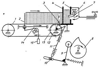 Поштучная подача блоков в агрегат БЗР производится с помощью самонаклада, принципиальная схема которого показана на рис. 8.9. Блоки вертикально, корешками вниз устанавливаются на тесемочный транспортер 1, наклоненный по отношению к горизонтали в сторону подачи блоков. Чтобы блоки не падали в обратную сторону, их поддерживает толкатель 2. Валик 13 периодически поворачивается на определенный угол при помощи собачки 3 и храповика 12, работающих от кулака 8, который находится на главном валу агрегата, качающегося рычага 9 и тяги 11. Величину подачи регулируют в зависимости от толщины блоков, передвигая шарнир 10 в прорези рычага 9 и меняя длину составной тяги 11. Толкатель 2 передвигается по направляющей 14 под действием груза 15. При подаче новой порции блоков толкатель 2 отводится назад. Желоб механизма подачи состоит из двух поддерживающих стенок 4 и 5. Расстояние между ними меняется в зависимости от толщины обрабатываемых блоков. Блок по дну желоба подается на установочный стол за два кинематических цикла двумя захватами 6 каретки 7, совершающей возвратно-поступательное движение в плоскости, перпендикулярной чертежу. В задней стенке 5 желоба есть прорезь для входа внутрь него захватов 6. Вначале блок перемещается первым захватом 6 в промежуточное положение между самонакладом и установочным столом, а при следующем цикле этот блок вторым захватом 6 подается на установочный стол.