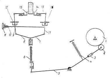 Две подвижные плиты 12 и 13 перемещаются возвратно-поступательно по станине агрегата симметрично корешку блока. Сближаясь, они сдавливают блок в корешке. Движение плитам 12 и 13 передается от кулака 1 через ролик 2, двуплечий рычаг 5, пружину 6 и двусторонние рычаги 7 и 8, соединенные с коромыслами 9 и 17. Центры поворота коромысел 9 и 17 находятся на ползунах 12 и 16, которые винтом 11, имеющим правую и левую резьбу, могут сдвигаться и раздвигаться относительно плоскости, проходящей через середину блока. Винтом 11 пользуются при переходе на обработку блоков другой толщины или при необходимости отрегулировать усилие прессования блока. Чтобы предохранить механизм от поломки, двуплечий рычаг 5 имеет предохранительное звено 3. Освобождается блок при помощи пружины 4, возвращающей систему в исходное положение.