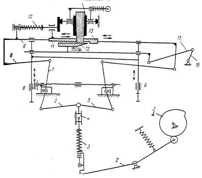 Сначала начинает работать механизм прижима. От кулака 1 через двуплечий рычаг 2, упругое звено 3, ползун 4 и симметричные рычаги 5, 7, 8, 9 движение передается двустороннему зажиму 11 и ползуну 13 (причем ползун 13 одновременно выполняет роль противоножа), которые, сближаясь, зажимают блок в зоне обрезки. Одновременно пружина 10 штоком дополнительно сдавливает зажимы 14 звена конвейера, в которых находится блок.