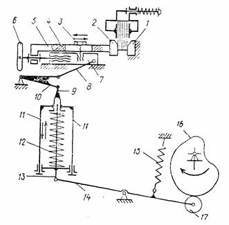 Возвратно-поступательное движение ползуну 7 сообщается кулаком 16, находящимся на главном валу агрегата, через ролик 17, коромысло 14, шток 13, пружину 12, вилку 9, двуплечий рычаг 10 и шатун 8. Опускание механизма происходит за счет пружины 15. Планки 11 удерживают упругое звено механизма в сборе. Для регулировки расстояния между плитами 1 и 2 болты 3 отпускают маховик с винтом 6 и гайкой 4, устанавливая требуемое расстояние между плитами 1 и 2, соответствующее толщине блоков. После регулировки болты 3 затягивают. Упругое звено с пружиной 12 предохраняет механизм от поломки.