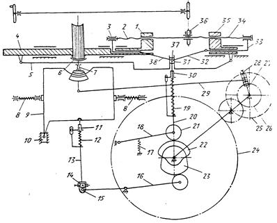 Тиски, зажимающие блок при отгибке фальцев, представляют собой два подвижных ползуна 1 и 4, установленных в направляющих станины. Ползун 1 состоит из двух частей – ползуна 1 и установленного в нем ползуна 3, которые связаны винтом 2. Ползун 4 шатуном 5 связан с ползуном 35, который также состоит из двух частей – ползуна 35 и установленного в нем ползуна 33, связанных винтом 34. Движение ползунам сообщается кулаком 22 через ролик 21, укрепленный на оси составного упругого толкателя 19, 20, 30 и систему ломающихся рычагов 32, 38. Силовое замыкание ролика 21 с кулаком 22 осуществляется пружиной 17 через рычаг 18.