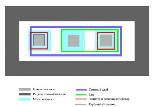 Необходимо сравнить поперечный размер базы с размером глубокого коллектора. Если размер ГК больше, то он, а не база ограничивает поперечный размер скрытого слоя и расстояние между изолирующими областями. А если меньше – ГК обычно делают прямоугольным, вытягивая в поперечном направлении до размера базы.