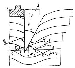 Наиболее простая и полная картина усилий, возникающих в процессе резания, может быть рассмотрена в плоскости, перпендикулярной линии реза.