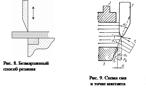 При безмарзанном способе резания применяется клиновидный подвижный нож и неподвижный плоский нож с острой гранью, т. е. линия реза образуется пересечением двух плоскостей: опорной и подвижной. Угол наклона лезвия подвижного ножа по отношению к стопе не меняется в течение всего процесса резания, рис.8.