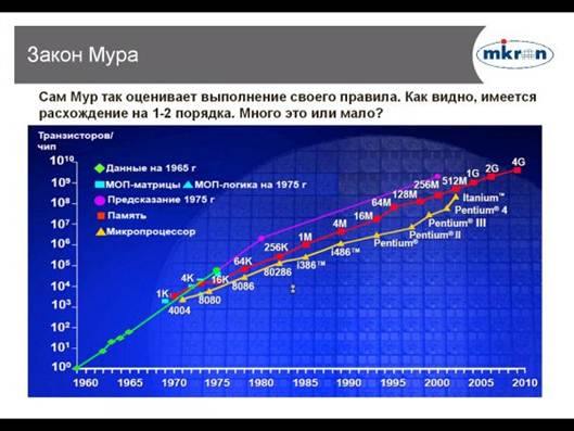 Закон Мура — эмпирическое наблюдение, сделанное в 1965 году (через шесть лет после изобретения интегральной схемы), в процессе подготовки выступления Гордоном Муром (одним из основателей Intel). Он высказал предположение, что число транзисторов на кристалле будет удваиваться каждые 24 месяца. Представив в виде графика рост производительности запоминающих микросхем, он обнаружил закономерность: новые модели микросхем разрабатывались спустя более или менее одинаковые периоды (18—24 мес.) после появления их предшественников, а ёмкость их при этом возрастала каждый раз примерно вдвое.