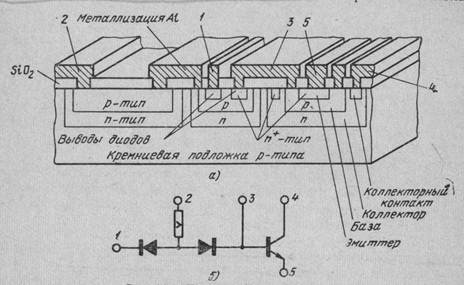 | Рис. 1.1 Полупроводниковая ИС: а – разрез схемы; б – электрическая схема |