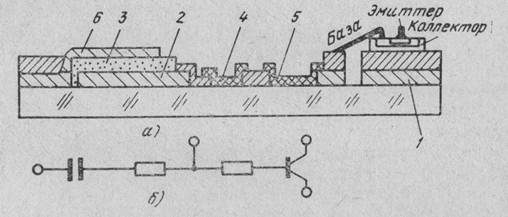 | Рис. 1.2 Гибридная ИС: а – расположение элементов пленочного модуля; б – электрическая схема пленочного модуля: 1, 2, 6 – пленка алюминия; 4, 5 – высокоомная пленка, образующая резисторы; 3 – диэлектрик конденсатора |