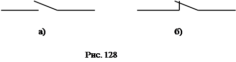 Переходным называется процесс, возникающий в электрической цепи при переходе ее от одного установившегося режима (старого) к другому установившемуся режиму (новому). Переходные процессы в цепи возникают в результате коммутаций. Под коммутацией понимают скачкообразные (мгновенные) изменения структуры (схемы) цепи или параметров ее отдельных элементов, вызванные включением, отключением или переключением отдельных ее участков. На электрических схемах коммутация обозначается в виде ключей в разомкнутом (рис. 128а) или замкнутом (рис. 128б) положении, при этом разомкнутый ключ в момент t = 0 замыкается, а замкнутый в момент t = 0 размыкается.