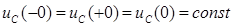 Второй закон коммутации гласит, что напряжение uC на выводах конденсатора C в момент коммутации не может измениться скачкообразно, т.е.