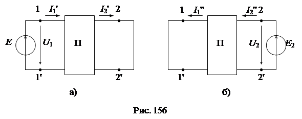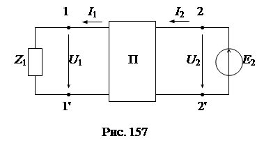 Установим связь между параметрами режима входа (U 1, I 1) и выхода (U 2, I 2). Для этой цели согласно теореме о компенсации заменим нагрузку Z 2 источником ЭДС Е 2 = U 2 = I 2 Z 2 и найдем токи по методу наложения от каждого источника в отдельности (рис. 156а, б):
