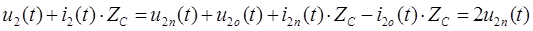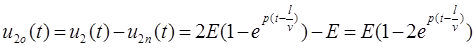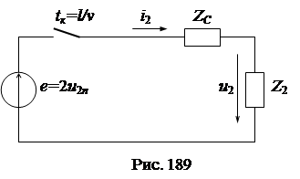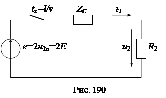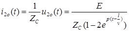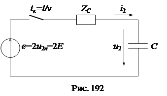 Напряжение и ток в конце линии находим из расчета переходного процесса в схеме замещения для конца линии (рис. 192).
