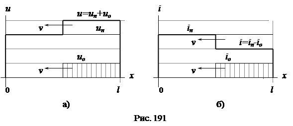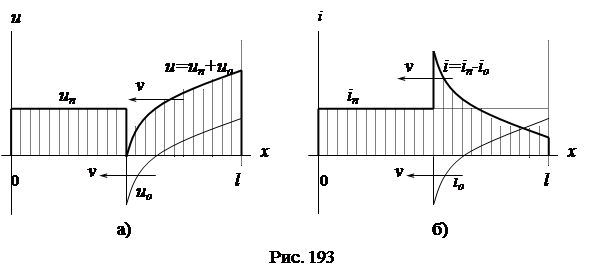 . Графические диаграммы распределения напряжения и тока вдоль линии с учетом отраженных волн показаны на рис. 191а, б.