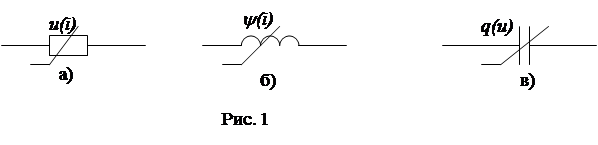 В теории линейных цепей предполагалось, что параметры всех элементов цепи являются постоянными величинами, не зависящих от токов и напряжений. Каждому идеальному элементу цепи приписывалось определенное значение его параметра: резистору – сопротивление R, катушке - индуктивность L, конденсатору – емкость C. Физические характеристики таких элементов (u=R × i – для резистора, ψ =L × i – для катушки, q=C × u – для конденсатора) описываются уравнением прямой линии y = a × x, поэтому такие элементы получили общее название линейных, а электрические цепи, состоящие из таких элементов, также называются линейными.