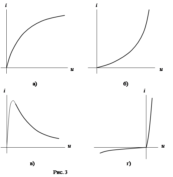На рис. 3г представлена графическая диаграмма ВАХ i=f (u) полупроводникового диода. ВАХ имеет ярко выраженную несимметричную форму в положительной и отрицательной областях, при этом R п << R о. Элементы такого типа применяются для преобразования переменного тока в постоянный.