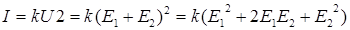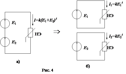 Одна из главных особенностей нелинейных цепей состоит в том, что к ним неприменим принцип наложения. Докажем это положение на примере расчета схемы рис. 4, в которой включены последовательно два источника ЭДС (Е 1, Е 2) и нелинейный резистор с заданной ВАХ I = kU 2.