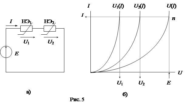 Пусть нелинейная цепь состоит из двух нелинейных элементов НЭ1 и НЭ2, включенных последовательно с источником ЭДС (рис. 5а). ВАХ нелинейных элементов заданы графически (рис. 5б).