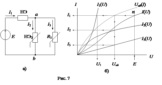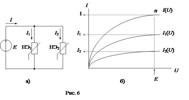 Пусть нелинейная цепь состоит из двух нелинейных элементов НЭ1 и НЭ2, включенных параллельно с источником ЭДС E (рис. 6а). ВАХ нелинейных элементов заданы графически (рис. 6б).