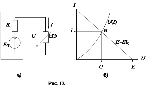 1-й этап. Выделяется ветвь с нелинейным элементом НЭ, а оставшаяся часть схемы заменяется эквивалентным генератором (рис. 12а). Параметры эквивалентного генератора Еэ и R 0 могу быть определены аналитически любым из методов расчета линейных цепей, так как в оставшейся части схемы не содержатся более нелинейные элементы.