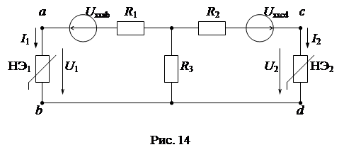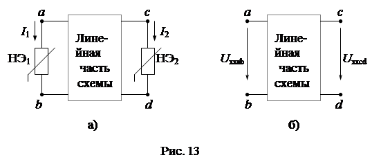 Пусть сложная схема содержит два нелинейных элемента НЭ1 и НЭ2 (рис. 13а).
