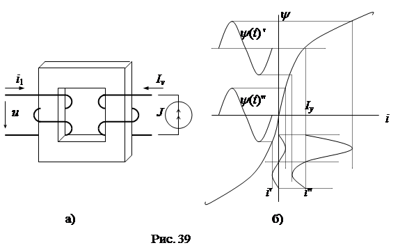Управляемая нелинейная катушка индуктивности содержит на общем магнитопроводе две обмотки, одна из которых рабочая обмотка w 1 включается в цепь переменного тока в качестве управляемого элемента, а вторая – обмотка управления w 0, которая питается от источника постоянного тока J (рис. 39а).
