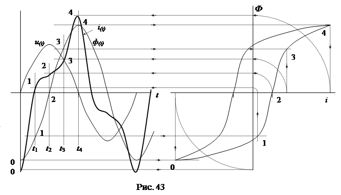 Графические диаграммы функций u (t)и ф (t)показаны на рис. 43. Справа приведена вебер-амперная характеристика ф (i)магнитной цепи в виде петли гистерезиса, соответствующая расчетной амплитуде магнитного потока Фm. Расчетные точки искомой функции i (t)получаются методом проекции точек заданной функции ф (t)на вебер-амперную характеристику ф (i)магнитной цепи.