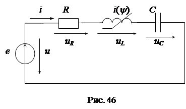 Рассмотрим применение этого метода на примере расчета схемы рис. 46. Пусть на входе схемы источник синусоидальной ЭДС e (t) = Em ·sin(wt), а вебер-амперная характеристика нелинейной катушки аппроксимирована уравнением i = a · sh (b · y).