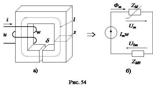Машины переменного тока, трансформаторы, в которых ферромагнитные сердечники подвергаются периодическому перемагничиванию, работают в режиме вынужденного синусоидального напряжения на их обмотках. Рассмотрим работу магнитной цепи на примере сердечника трансформатора (рис. 54а). К обмотке трансформатора приложено синусоидальное напряжение