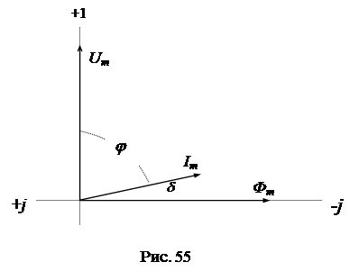 . Угол отставания δ получил в технике название угла потерь. Очевидно из векторной диаграммы (рис. 55), что δ = 90˚- φ или φ = 90˚- δ.