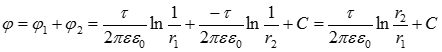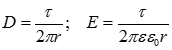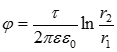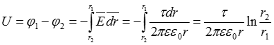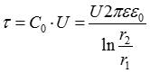 Реальные заряды в коаксиальном кабеле расположены равномерно по поверхности внутреннего провода (жиле) и на внутренней поверхности внешней оболочки. В соответствии со вторым следствием из теоремы единственности заменим поверхностные заряды внутреннего провода осевым зарядом с линейной плотностью t, после чего к расчету параметров поля можно применить положения и выводы, полученные ранее для заряженной оси: