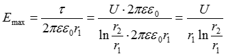 Наибольшее значение напряженности поля имеет место на поверхности внутреннего провода при