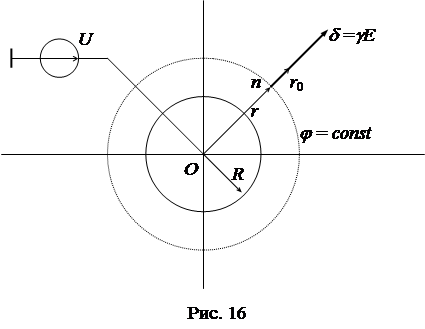 Пример 1. Заземлитель шаровой формы с радиусом R находится на большой глубине h (h>>R). К заземлителю подведено напряжение U (рис. 16).