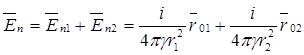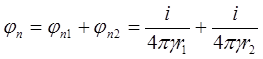 проводящей средой γ и зеркально расположим там такой же заземлитель той же полярности, при этом граничные условия на поверхности земли не изменятся (линии вектора Е направлены по касательной вдоль поверхности). Заменим токи, стекающие с поверхностей обоих заземлителей, равными по величине точечными токами, растекающимися из электрических центров 1 и 2, которые будут смещены относительно геометрических центров так, чтобы сохранились прежними граничные условия на поверхности шаров (поверхности должны остаться эквипотенциальными с потенциалом φ=U). После определения положения электрических центров расчет параметров поля в произвольной точке n производится по методу наложения:
