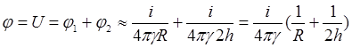 При соотношении h>>R потенциал на поверхности заземлителя будет равен: